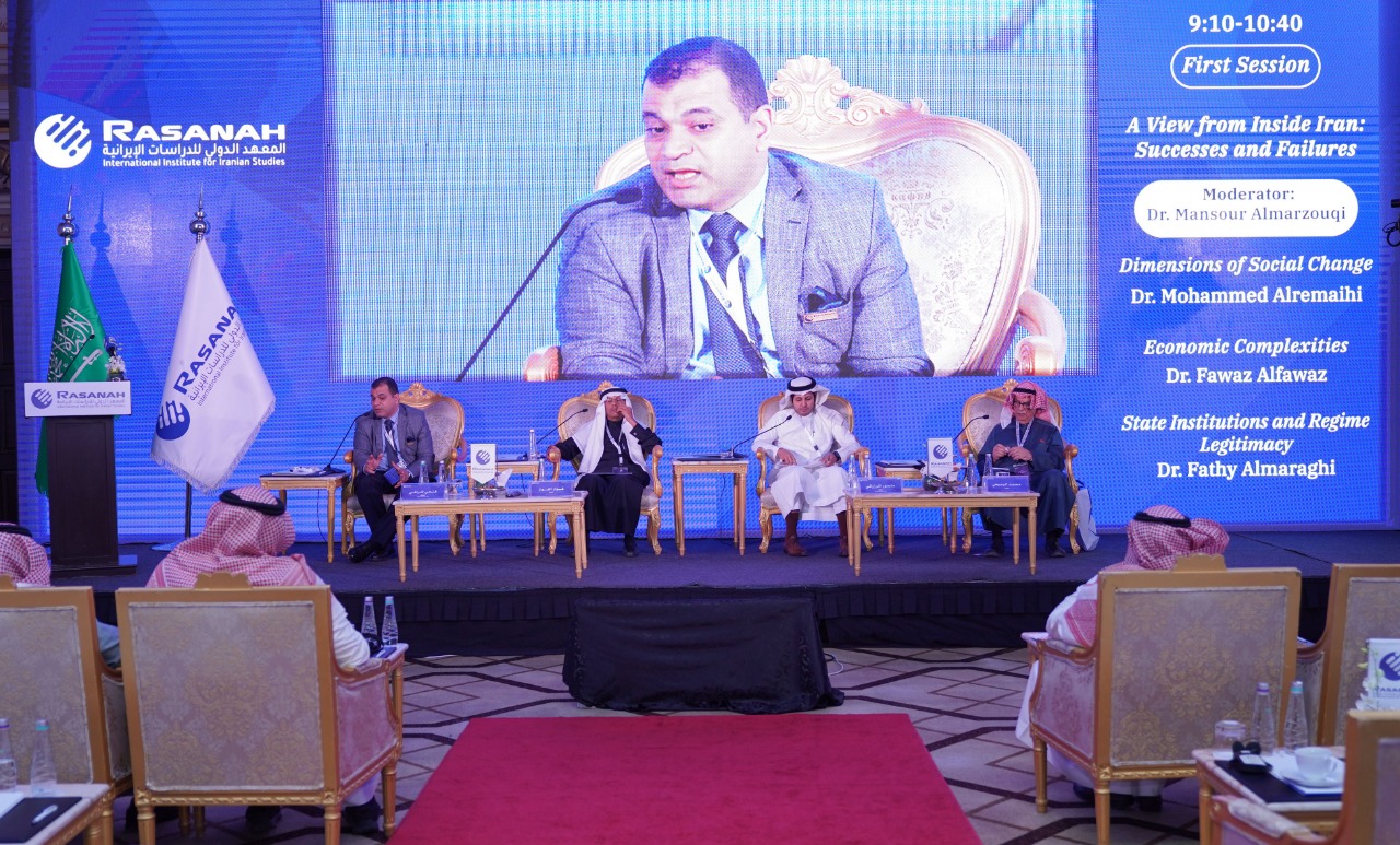 وشهد المؤتمر ثلاث جلسات، حملت الأولى عنوان «إيران من الداخل: النجاحات والإخفاقات»، أدارها المشرف على مركز الدراسات الاستراتيجية بمعهد الأمير سعود الفيصل للدراسات الدبلوماسية الدكتور منصور المرزوقي، وشارك فيها كل من: أستاذ علم الاجتماع السياسي في جامعة الكويت الدكتور محمد الرميحي والمستشار الاقتصادي الدكتور فواز الفواز، ورئيس مركز الدراسات والبحوث في «رصانة» الدكتور فتحي المراغي. وتحدث الرميحي في الجلسة عن «أبعاد التغيير في المشهد الاجتماعي في إيران»، لافتًا إلى وجود تناقض شديد في تسمية «الجمهورية الإسلامية الإيرانية»، إذ إن النظام الجمهوري في هذه الدولة يتضمن تداولًا للسلطة، إلا أن متخذ القرار الدائم فيها هو المرشد الأعلى غير المنتخب. ورأى الرميحي أن النظام الإيراني ينظر إلى المستقبل بأعيُن الماضي، مشيرًا إلى أن عالَمنا اليوم لا يمكن إدارة مجتمعاته بالآيديولوجيا.