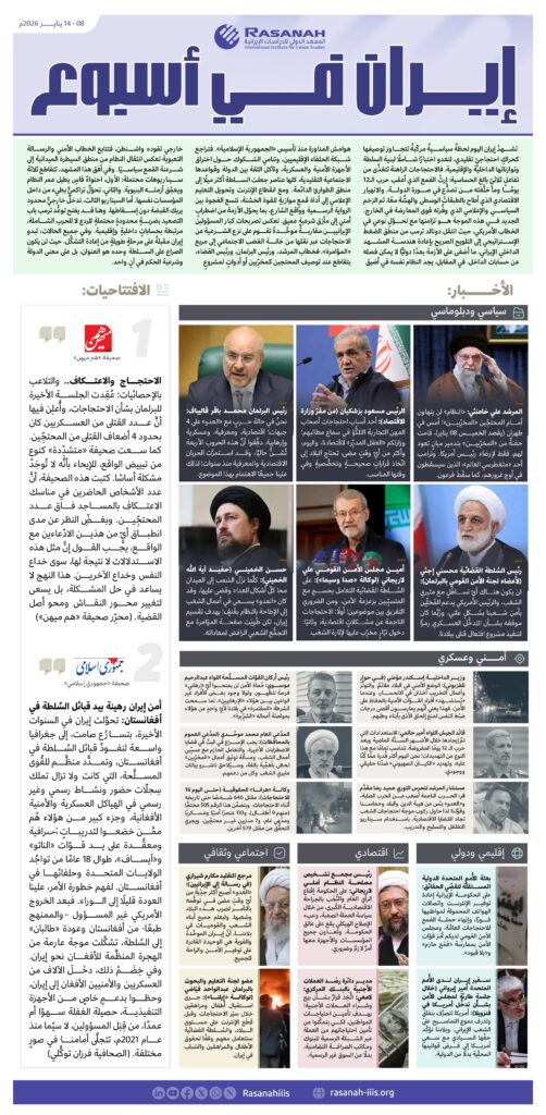 إيران في أسبوع.. من الخميس 8 يناير إلى الأربعاء 14 يناير 2026م https://rasanah-iiis.org/?p=38605 دراسات تقارير تقارير تقارير خبرية الصحافة الإيرانية مقالات تقدير موقف المجلة الأخبار الإصدارات التقارير الاستراتيجية السنوية التقارير الشهرية الكتب الأنشطة المؤتمرات والندوات جدول النشاطات معرض الصور ورش العمل مركز التدريب البرامج التدريبية ميديا انفو جرافيك فيديو المزيد مجلس الأمناء الإدارة التنفيذية 03:15 م - 15 يناير 2026 بواسطةالمعهد الدولي للدراسات الإيرانية المعهد الدولي للدراسات الإيرانية إدارة التحرير