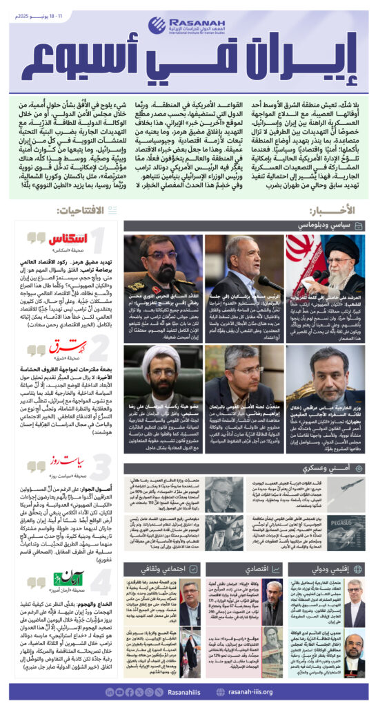 إيران في أسبوع 11 – 18 يونيــــــو 2025م https://rasanah-iiis.org/?p=37760 دراسات تقارير تقارير تقارير خبرية الصحافة الإيرانية مقالات تقدير موقف المجلة الأخبار الإصدارات التقارير الاستراتيجية السنوية التقارير الشهرية الكتب الأنشطة المؤتمرات والندوات جدول النشاطات معرض الصور ورش العمل مركز التدريب البرامج التدريبية ميديا انفو جرافيك فيديو المزيد مجلس الأمناء الإدارة التنفيذية 12:52 م - 19 يونيو 2025 بواسطةالمعهد الدولي للدراسات الإيرانية المعهد الدولي للدراسات الإيرانية إدارة التحرير