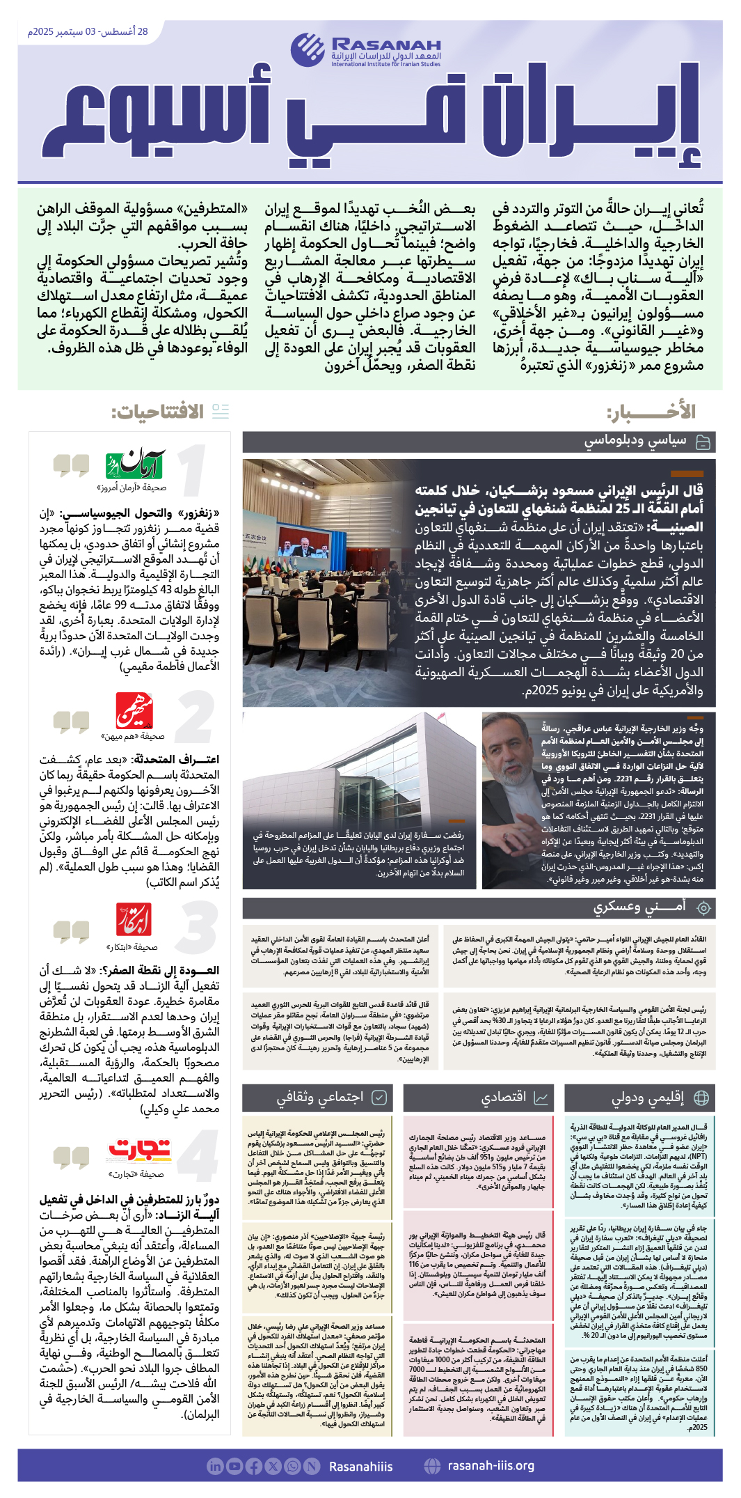 إيران في أسبوع 28 أغسطس – 3 سبتمبر 2025 https://rasanah-iiis.org/?p=38040 دراسات تقارير تقارير تقارير خبرية الصحافة الإيرانية مقالات تقدير موقف المجلة الأخبار الإصدارات التقارير الاستراتيجية السنوية التقارير الشهرية الكتب الأنشطة المؤتمرات والندوات جدول النشاطات معرض الصور ورش العمل مركز التدريب البرامج التدريبية ميديا انفو جرافيك فيديو المزيد مجلس الأمناء الإدارة التنفيذية 10:37 ص - 06 سبتمبر 2025 بواسطةالمعهد الدولي للدراسات الإيرانية المعهد الدولي للدراسات الإيرانية إدارة التحرير