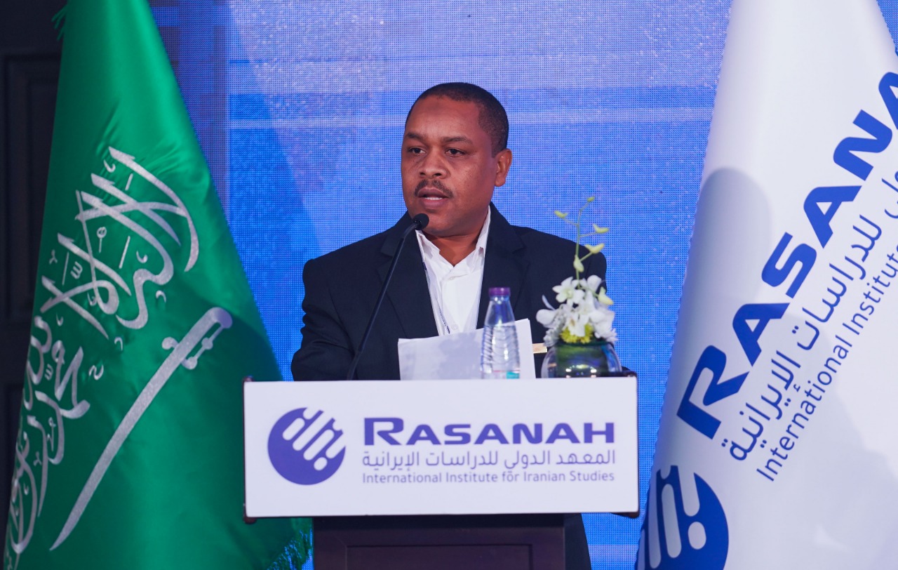 وخُتم المؤتمر بجلسة ثالثة حملت عنوان «مستقبل إيران في ظلّ ضغوطات الخارج وتحديات الداخل»، أدارها أستاذ الصحافة بكلية الإعلام والاتصال في جامعة الإمام الدكتور أحمد الجميعة، وشارك فيها كل من: الكاتب والباحث السياسي في معهد «رصانة» الدكتور معتصم صديق عبد الله، والكاتب السياسي في صحيفة الشرق الأوسط ورئيس جائزة هاني فحص للحوار والتعددية الاستاذ مصطفى فحص. وتحدث الدكتور معتصم عن «مستقبل تصدير الثورة في ظلّ التحديات»، وقال إن «إيران مدّت أذرع نفوذها في المنطقة مستغلة ظروف الحروب الأهلية والأزمات الداخلية فيها». وأكَّد أن العقوبات الأمريكية قيّدت حرية وسهولة التحرك الإيراني. وعدّد معتصم أدوات إيران في تصدير ثورتها التي أشار إلى أنها عبر: المستشاريات الثقافية، ومؤسسة الإذاعة والتليفزيون، والحرس الثوري وفيلق القدس، ورفع راية نصرة المكوِّن الشيعي، والحَضّ على تبنِّي الهوية الطائفية.
