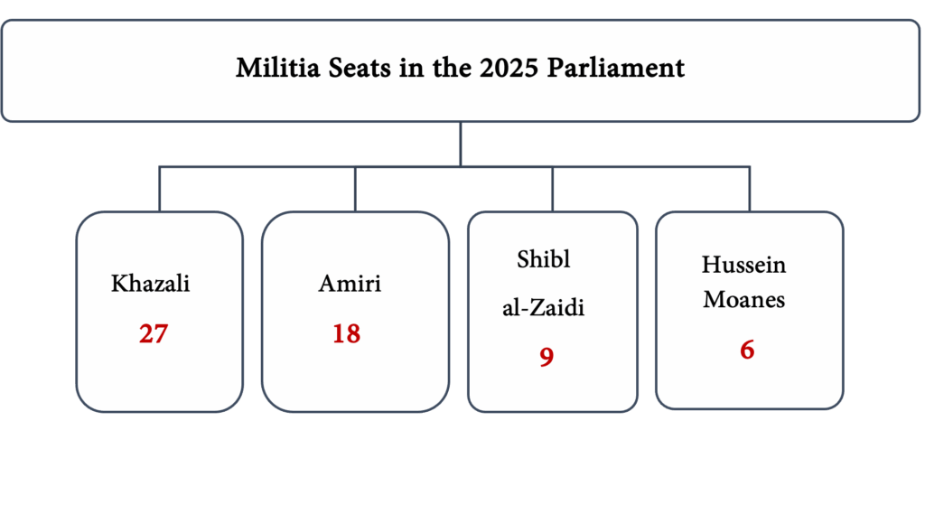 The fact that the four militias participating in the elections secured 55 seats, while most civilian alliances failed to win any (except for Badil, which gained only four seats), highlights a strengthened militia presence in the new parliament and the broader Iraqi political scene. This could result in: