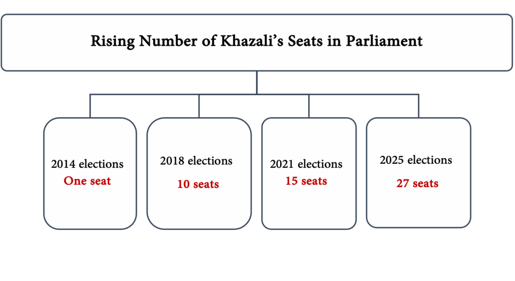 - -The Huquq Movement: The political arm of the Iraqi Hezbollah, designated as a terrorist organization by the United States. It is led by Kata’ib Hezbollah Commander Hussein Moanes (Abu Ali al-Askari), known for his proximity to Iran as well as his hardline rhetoric — such as his 2022 threat against former Prime Minister Mustafa al-Kadhimi. The movement began under the Coordination Framework but opted to run independently to expand its political footprint and secure seats that would reinforce the militia-dominated political order. It won one seat in 2022, but after the Sadrist withdrawal, its share rose to six seats.