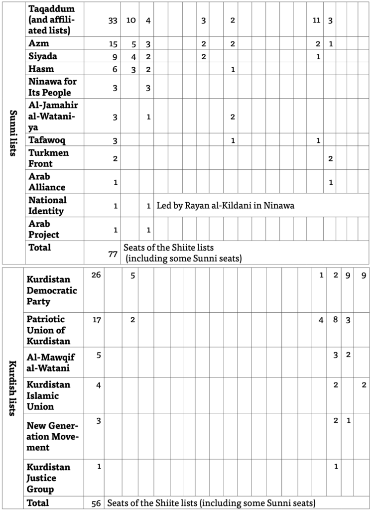 For the first time since 2005, Sunni alliances participated in the elections with minimal Iranian involvement, amid a regional and international inclination to sideline Iran’s influence in Iraq. The key Sunni alliances are listed in the Table 6 below.