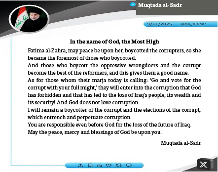 [6] “The Marjaya Protects Those Who Boycott Saying Participation in Elections Is a Matter of Personal Conviction,” Al-Wathika, October 20, 2025, accessed November 7, 2025, https://bit.ly/4p0mnom. [Arabic].