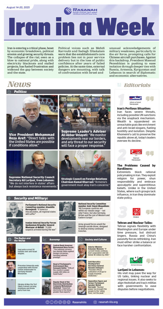 Iran In A Week August 14-20, 2025 https://rasanah-iiis.org/english/?p=13766 Research and Studies Position Papers The Journal Monitoring and Translation Iran In A Week Reports Articles Publications Annual Strategic Reports Monthly Reports Books News Board of Trustees Executive Department Multimedia Infographics Video Partnerships Policy Advice 02:59 pm - 21 Aug 2025 ByRasanah Rasanah Editorial Team