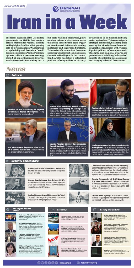 IRAN IN A WEEK January 22-28, 2026 https://rasanah-iiis.org/english/?p=14137 Research and Studies Position Papers The Journal Monitoring and Translation Iran In A Week Reports Articles Publications Annual Strategic Reports Monthly Reports Books News Board of Trustees Executive Department Multimedia Infographics Video Partnerships Policy Advice 04:36 pm - 29 Jan 2026 ByRasanah Rasanah Editorial Team