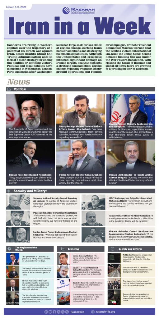 IRAN IN A WEEK March 5-11, 2026 https://rasanah-iiis.org/english/?p=14246 Research and Studies Position Papers The Journal Monitoring and Translation Iran In A Week Reports Articles Publications Annual Strategic Reports Monthly Reports Books News Board of Trustees Executive Department Multimedia Infographics Video Partnerships Policy Advice 02:37 pm - 12 Mar 2026 ByRasanah Rasanah Editorial Team