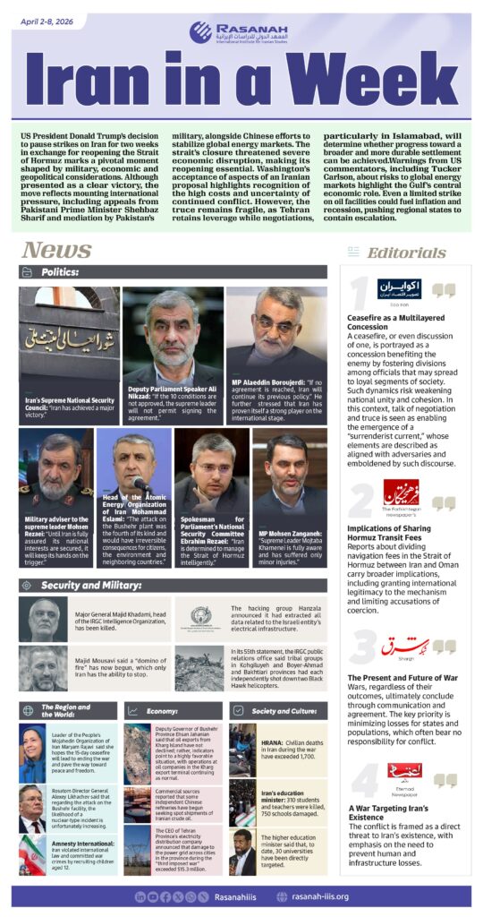 IRAN IN A WEEK March April 2-8, 2026 https://rasanah-iiis.org/english/?p=14290 Research and Studies Position Papers The Journal Monitoring and Translation Iran In A Week Reports Articles Publications Annual Strategic Reports Monthly Reports Books News Board of Trustees Executive Department Multimedia Infographics Video Partnerships Policy Advice 02:19 pm - 09 Apr 2026 ByRasanah Rasanah Editorial Team