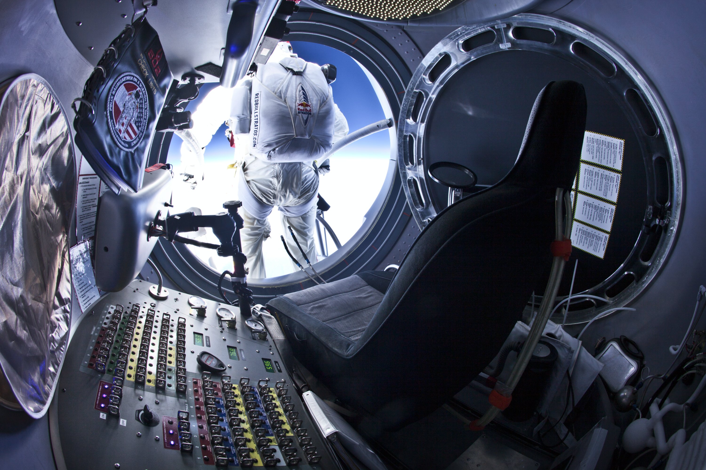 Pilot Felix Baumgartner of Austria steps out from the capsule during the second manned test flight for Red Bull Stratos in Roswell, New Mexico, USA on July 25, 2012. Red Bull Stratos is a mission to the edge of space to an altitude of 37.000 meters to break several records including the sound of speed in freefall. // Jay Nemeth/Red Bull Content Pool // P-20120725-00224 // Usage for editorial use only // Please go to www.redbullcontentpool.com for further information. //